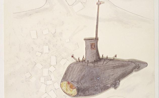 Panamarenko baut nicht nur poetische Installationen, er zeichnet auch Bilder seiner Konstruktionen. Hier sehen Sie eine Studie des U-Bootes Panama, mit dem Panamarenko nach Nova Zembla fahren wollte.