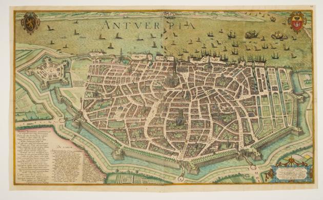 Joris Hoefnagel hat einen sehr schönen und detaillierten Plan der Stadt Antwerpen und der Zitadelle angefertigt. Er zeigt die Stadt in der Vogelperspektive. Sie erkennen auf dem Plan das Stadtbild und die bedeutendsten Monumente. Der Stich erschien in dem Buch „Civitates Orbis Terrarum“, das in der Zeit zwischen 1572-1616 herausgegeben wurde.