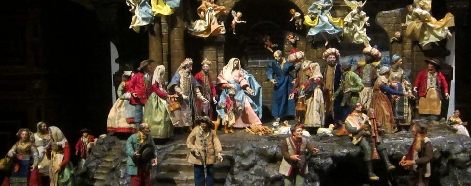 The scene consists of 61 figures. The birth of Christ is set in an impressive Roman ruin with different levels and numerous colourful characters. In addition to the familiar Biblical characters, there is a vast choir of angels, a procession of exotic figures and numerous village and city dwellers. The Neapolitan nativity scene is a showpiece and a theatrical spectacle all in one. It is a lively and cheerful presentation of the Christmas story with a great sense of expression and countless details. It was worked on by woodcarvers, goldsmiths and silversmiths, potters and tailors.