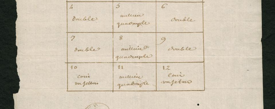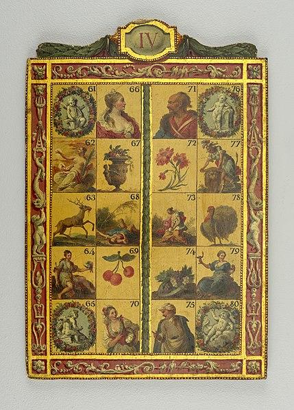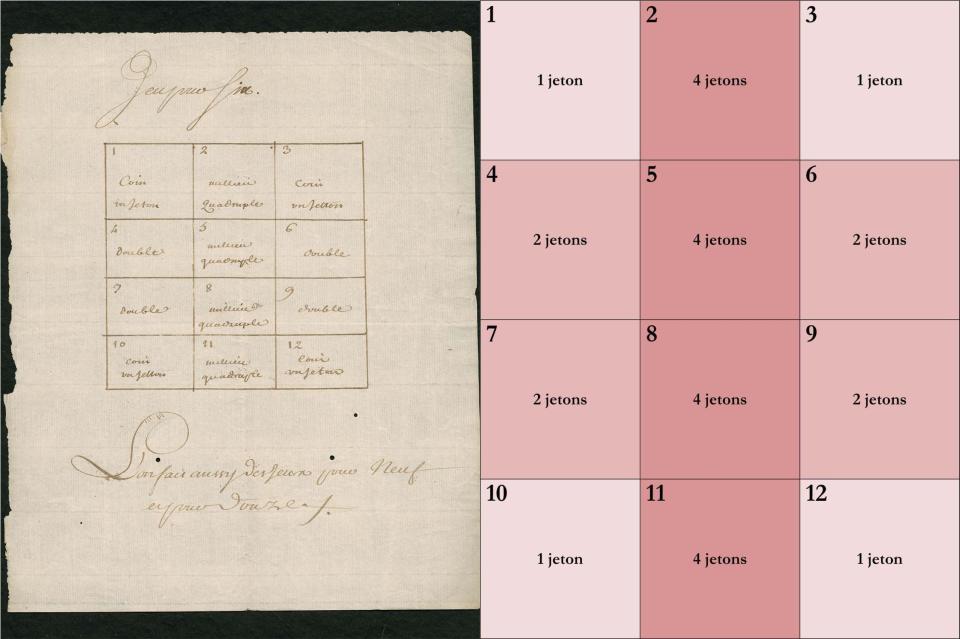 According to the rules, Cavagnole is played with six players, although nine or twelve is also possible. Each player has twelve numbered “tableaus” or tiles, which they may arrange in three columns of four tiles of their choosing. The tableaus were beautifully illustrated in the eighteenth century. Each player may then distribute eight “tokens” or jetons across the tableaus, maximum one jeton per tableau.