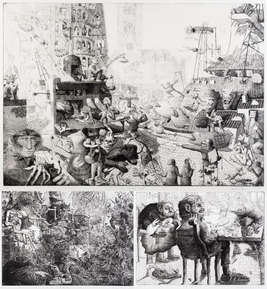 Adriaan Marin met drie werken: Ummagumma, ets op papier, 515 x 615; The liar, ets op papier, 415 x 615 en Een zonderlinge herfst, ets op papier, 615 x 815