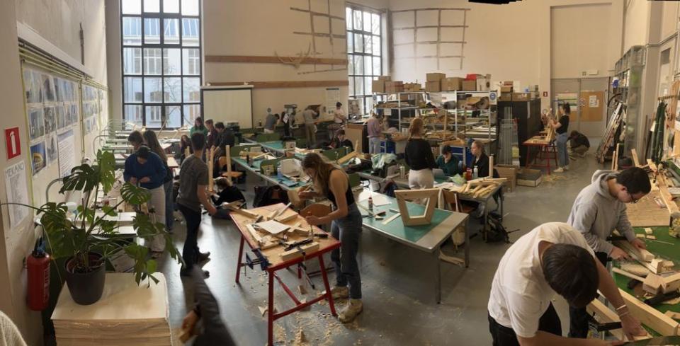 De studenten kozen voor een van de locaties en gingen aan de slag. Ze onderzochten de architectonische mogelijkheden van hout aan de hand van verschillende ontwerpthema’s die eigen zijn aan het materiaal: vervlechting, tektoniek, stapelen, reliëf, ultralicht en ruimteraster. In 15 dagen leerden ze de basisvaardigheden van houtbewerking met handzagen en beitels. Zo leerden ze een materiaaltaal kennen die bijdroeg aan de architectonische ingreep die ze in de gegeven context passend vonden.