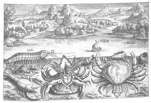 Twee krabben, een kreeft en een garnaal