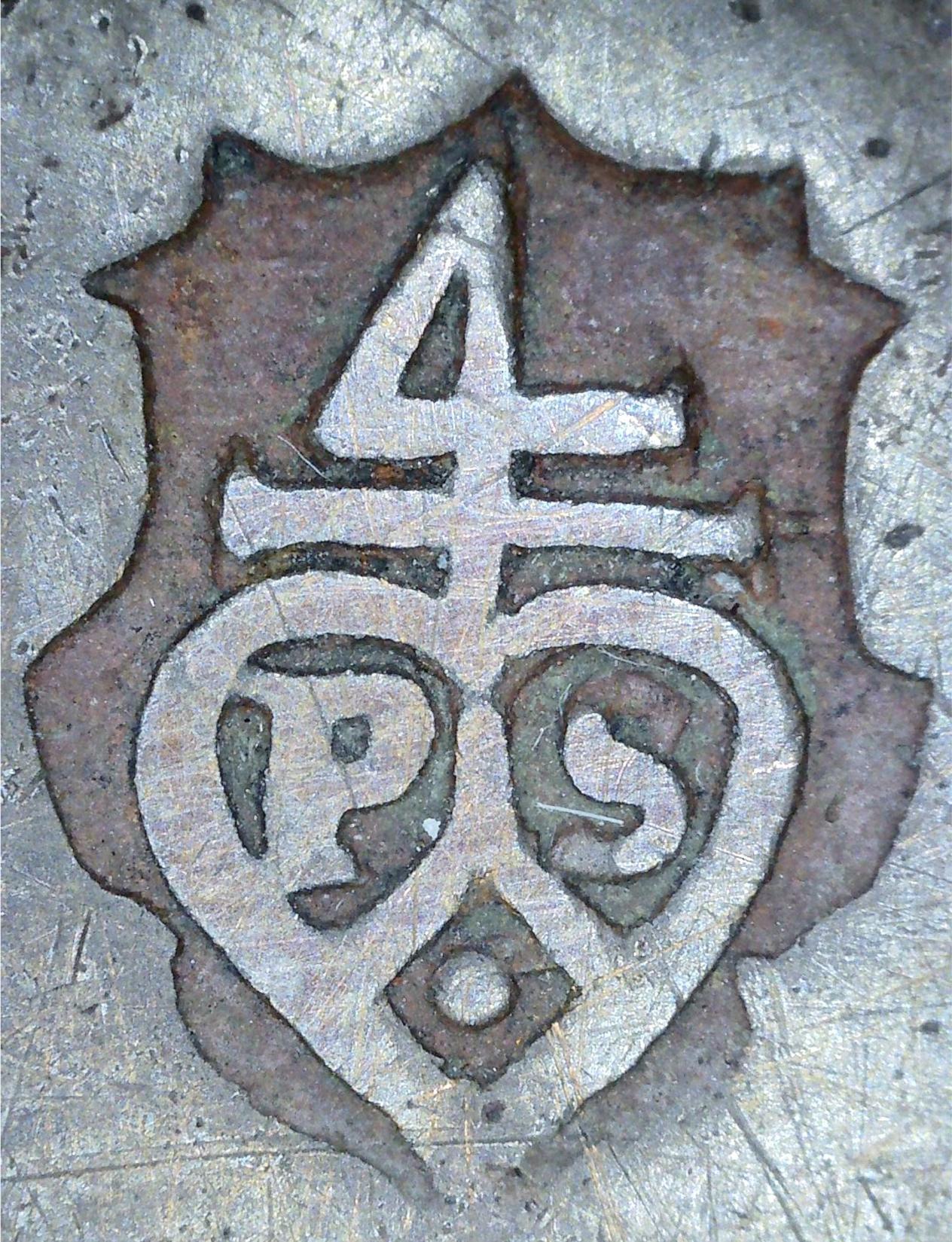 Het merkteken van kopersmid Peeter Stas in detail (PK_KP_03358). In werkelijkheid is het teken slechts 7mm hoog, op een plaat van 211 bij 148 mm