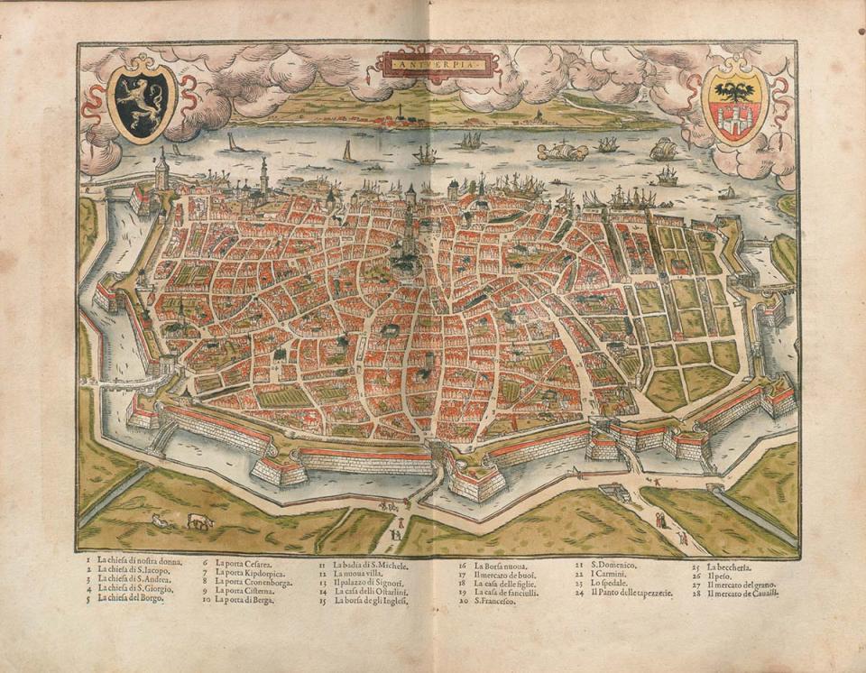 De eerste uitgaven van Guicciardini’s Descrittione di tutti i Paesi Bassi verschenen in 1567 en 1568 bij de Antwerpse drukker Willem Silvius. Toen Christoffel Plantin een uitgave van dit werk plande, liet hij de illustraties etsen in koperplaat die meer gedetailleerde voorstellingen kunnen weergeven. Guicciardini’s beschrijving van de Nederlanden kende een groot succes en werd, behalve in het Italiaans en Frans, ook vertaald in het Duits (1580). Een Nederlandse vertaling verscheen voor het eerst in 1612 te Amsterdam. In 2021 zal het werk centraal staan in een tentoonstelling die het Museum Plantin-Moretus organiseert.