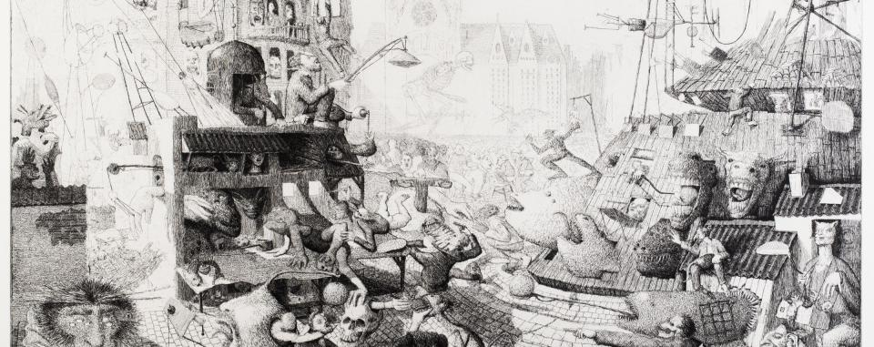 ‘Na zijn studie aan de Koninklijke Academie voor Schone Kunsten te Antwerpen bekwaamde Henri Ardui zich verder in de tekenkunst aan ‘The Royal Drawing School in Londen’. Na zijn terugkeer vestigde hij zich terug in Antwerpen en werkt nu als docent tekenen aan het DKO van de Academie. De werken die hier aangeboden werden dateren uit zijn Masterjaar. In zijn grafisch oeuvre maakt Henri graag gebruik van architecturale beeldelementen. Hier heeft hij een bijna post apocalyptische sfeer geschapen die vervreemdend en eenzaam overkomt. In zijn oeuvre gaat Henri eveneens op zoek naar een balans tussen beeld en materie. De extreme zuring, zelfs door de plaat heen, heeft ertoe geleid dat er een zeer persoonlijke vertaling is ontstaan. De drukken worden als het ware bas-reliëfs waarbij de inkt letterlijk in de hoogte ligt. Hier wordt dit typerend diepdrukaspect in al zijn kwaliteit gebruikt. Het bovenop liggende inktvolume is één van de beeldkwaliteiten die zo typerend zijn voor diepdruk. De toepassing van het etsen in meerdere fazen zorgt voor een grote dieptewerking.’