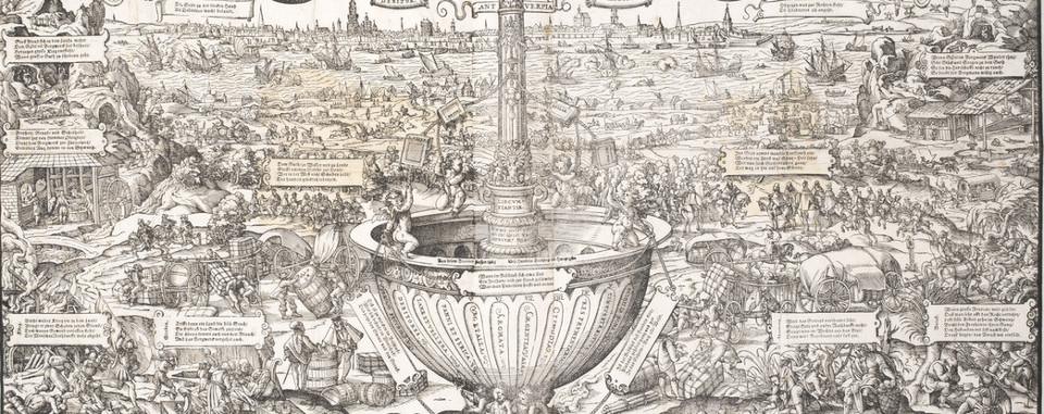 Waarom plaatst Amman Antwerpen in het midden van de prent, terwijl hij zelf in Neurenberg werkte? Deze allegorie bewijst eens te meer dat Antwerpen de draaischijf was van de internationale handel.