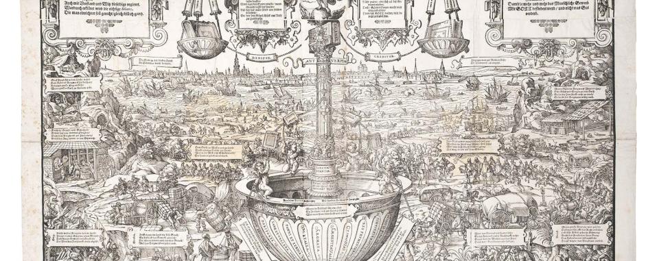 In de prent ‘De allegorie van de handel’ staan er twee zaken centraal: de rede van Antwerpen als hét icoon van de handelsbedrijvigheid en de god Mercurius die een weegschaal speels tussen zijn benen houdt terwijl hij omgeven is door de tekens van de dierenriem. In het midden van het universum van het menselijk bedrijf staat het wegen.