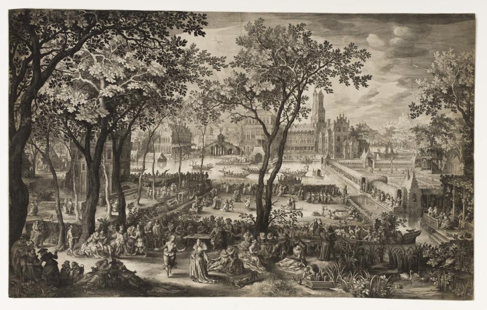 David Vinckboons (1576-1632) ontwerper, Nicolaas de Bruyn (1571-1656) graveur. Tuinfeest voor een kasteel (+/- 1600). Kopergravure. PK.OP.19800
