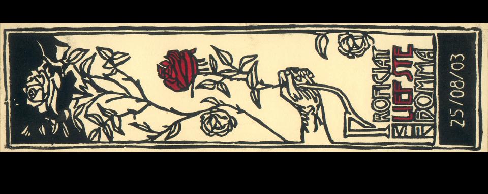 Naast mijn praktijk als beeldend kunstenaar schrijf ik wel eens poëzie en sinds kort ook proza. Boeken zijn me dus dierbaar. In de eerste jaren van mijn hogere studies in de beeldende kunsten mocht ik heel wat grafische technieken uitproberen, later verdiepte ik me in actuele kunstvormen. Jaren geleden maakte ik op een spontane manier voor mijn fantastische grootmoeder Margot's 83ste verjaardag (1920-2011) deze retro bladwijzer. Zij kwam zelf uit een schildersfamilie die in de jaren vijfig en zestig democatische schilderijen over heel de wereld verspreide en was het kloppend hart van een grote familie. De beelden uit de houtsnedencollectie van het museum (die ik tijdens mijn studies leerde kennen) hebben onbewust deze creatie beïnvloed.