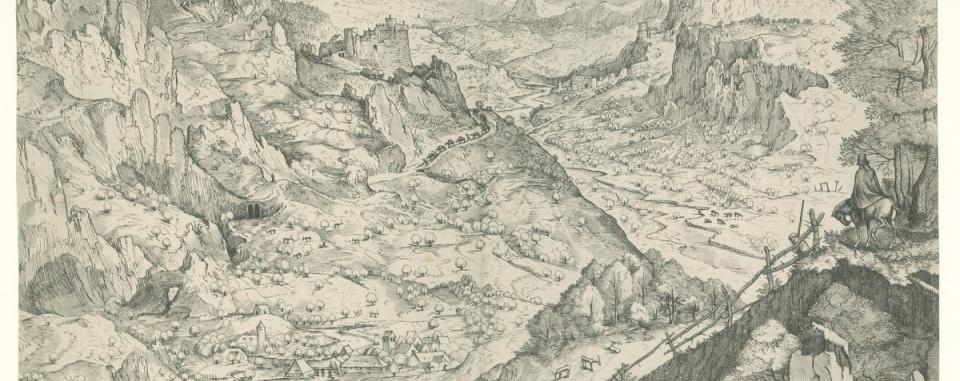 Rechts op de voorgrond een ruiter te paard die een groots en duizelingwekkend landschap overschouwt. Bruegel had een fascinatie voor de Alpen, het gebergte dat hij ontdekte toen hij in 1552-1554 naar Frankrijk en naar Italië reisde.