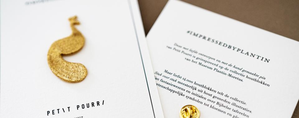 ‘Ik creëer voornamelijk geborduurde strijkontwerpen met metallic gouden garen. Die strijken mensen op hun lievelingskledij of op een mooi stuk stof en ze gaan er nooit meer af. De twee pins die ik heb gemaakt voor het museum zijn anders. Die kan je opspelden en er weer afhalen, en dus combineren met eender welke outfit. Zo draag je mijn positieve verhalen, én een stukje Plantijn-erfgoed, waar en wanneer jij dat wilt.