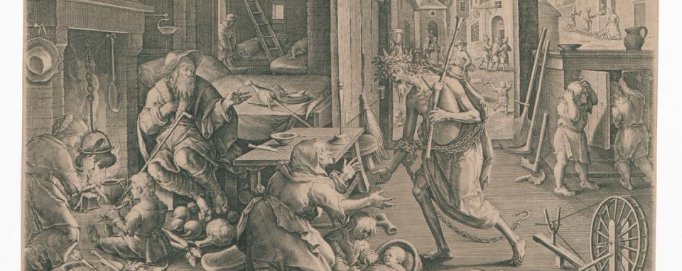 De dood bezoekt de armen, Jan van der Straet - Johann Sadeler I, 1572-1600