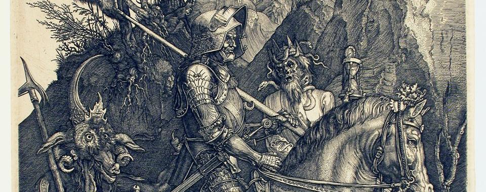Jan Wierix (1549-1618) sneed deze uiterst gedetailleerde kopie van ‘De ridder, de dood en de duivel’, een gravure van Dürer. Wierix was amper 15 jaar. Dat bewijst inscriptie linksboven ‘AE.15’, de Latijnse afkorting voor leeftijd. Rechtsonder leest u de datum van vervaardiging: 1564.