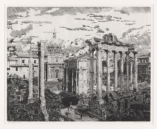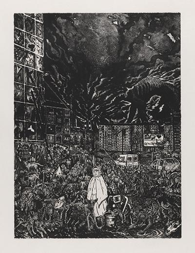 De nuances in het vlakkenspel, resultaat van de aquatint techniek, zorgen voor contrast en sfeer, nemen een fragiel karakter aan en maken een mooie verbinding met het lijnenspel.