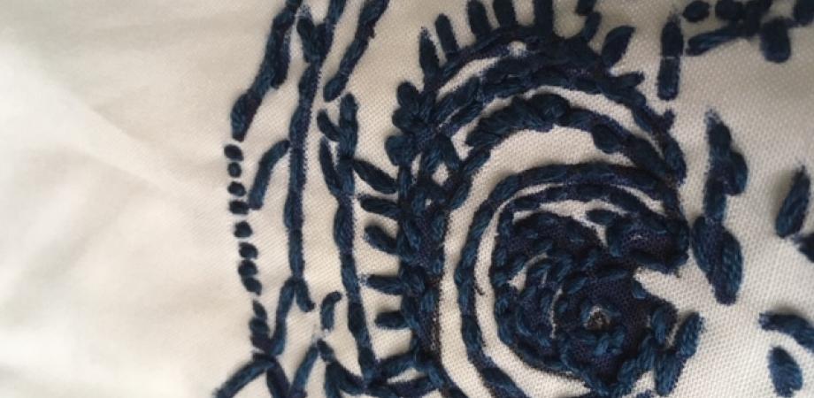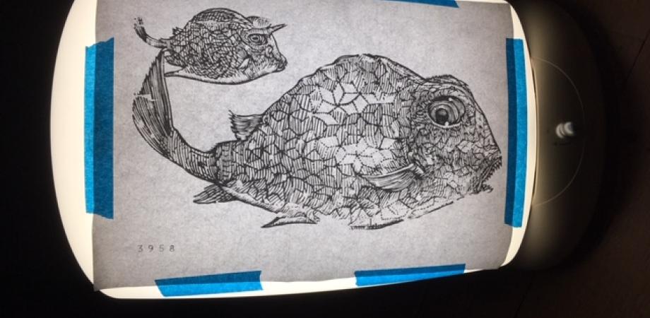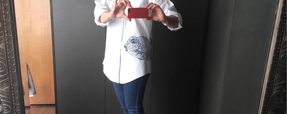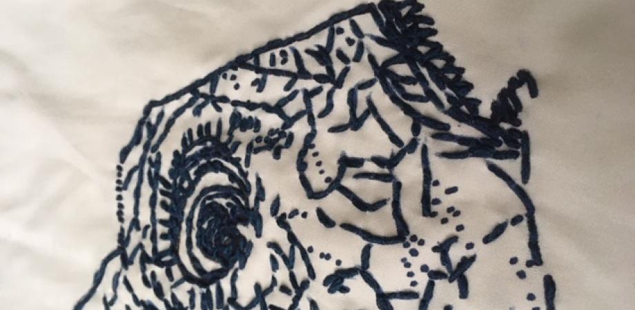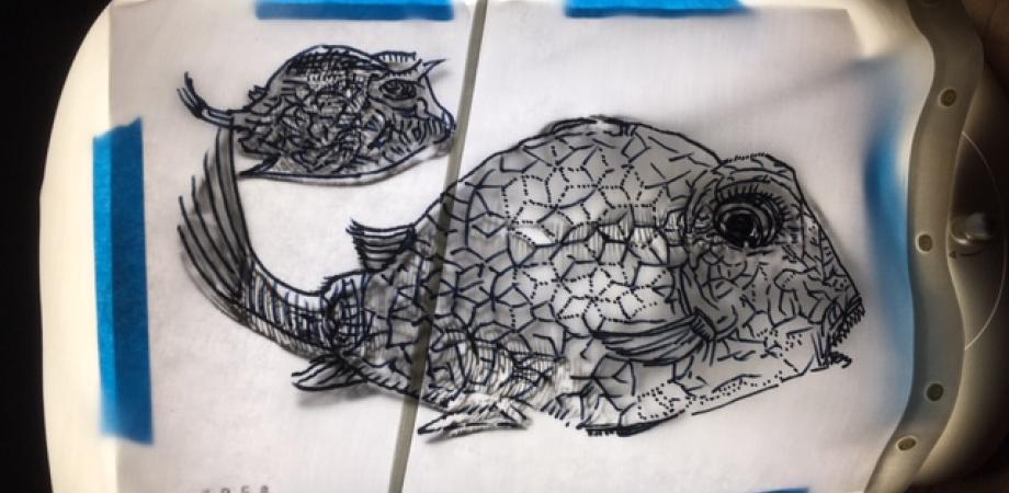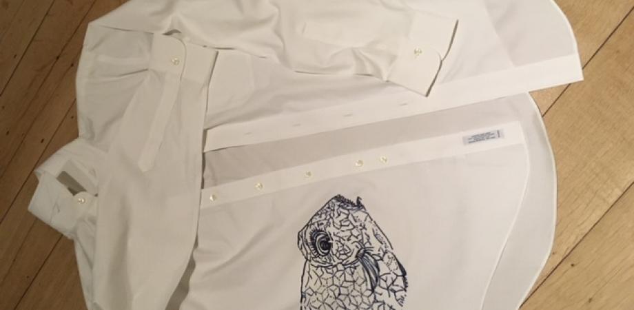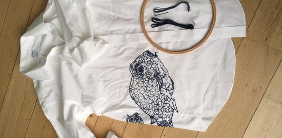 Ik printte de vis op A3 formaat en plakte het papier op een lichtbak. Dan tekende ik de vis over op het hemd, een beetje vereenvoudigend, met een blauwe textielstift. Gestreken om te fixeren, dan in een vrije steek met borduurzijde ingeborduurd.