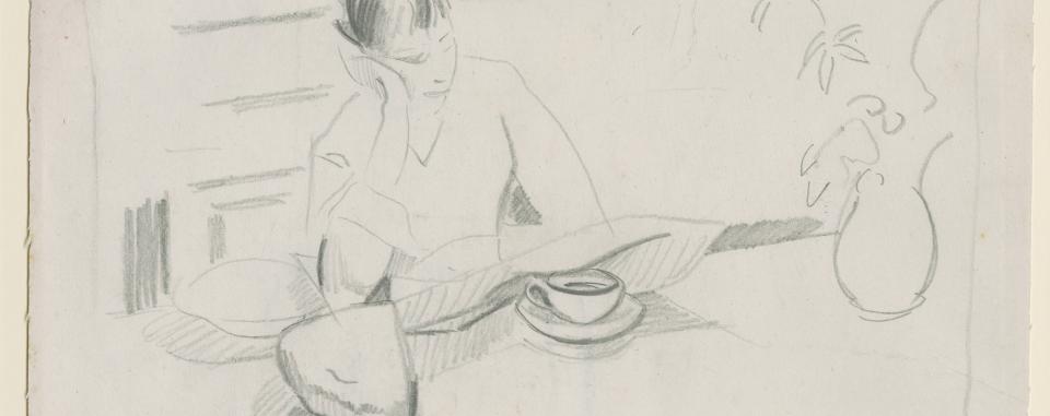 Deze tekening van Nel aan de ontbijttafel maakte Wouters in potlood. Rechtsonder staat er ‘Le déjeuner 1913’.