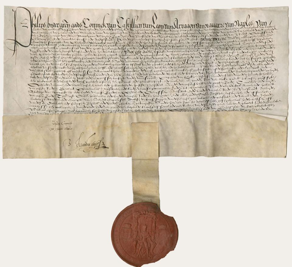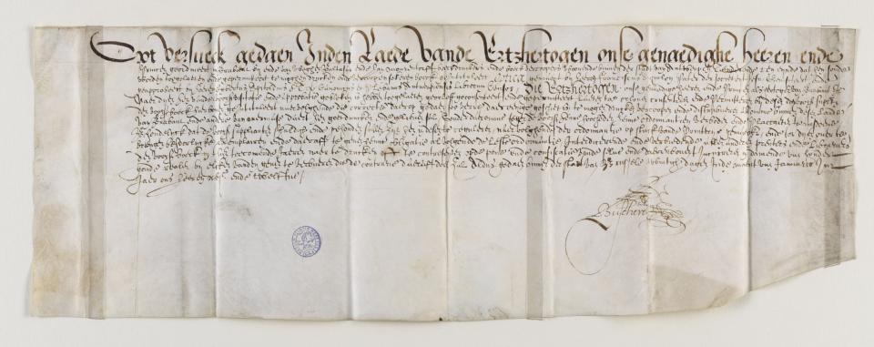 Privilege toegekend door de Geheime Raad aan Gerard Mercator voor zijn wereldkaart (mappa universalis) voor de periode van 10 jaar, 2 september 1569 (MPM Arch. 1179, nr. 103)