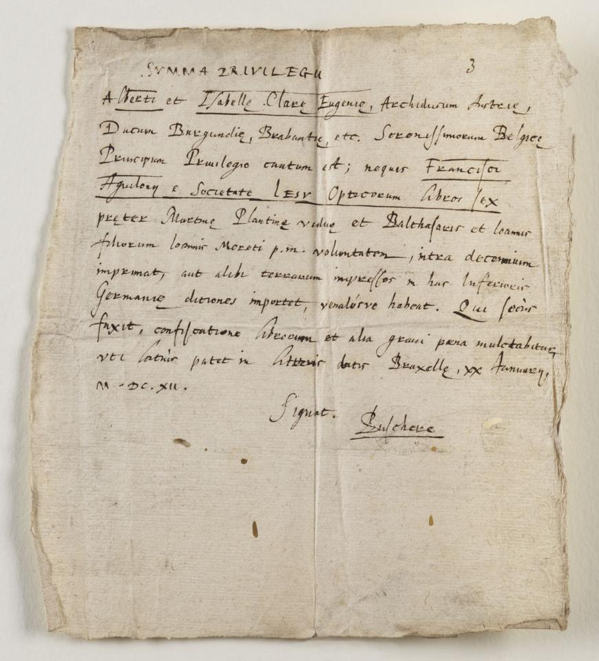 Het bijzondere aan de casus van Aguilonius is dat we niet alleen over het privilege en de gedrukte samenvatting beschikken maar ook over het document dat beiden verbindt. Het concept van de samenvatting in het handschrift van Balthasar I Moretus is immers bewaard gebleven.