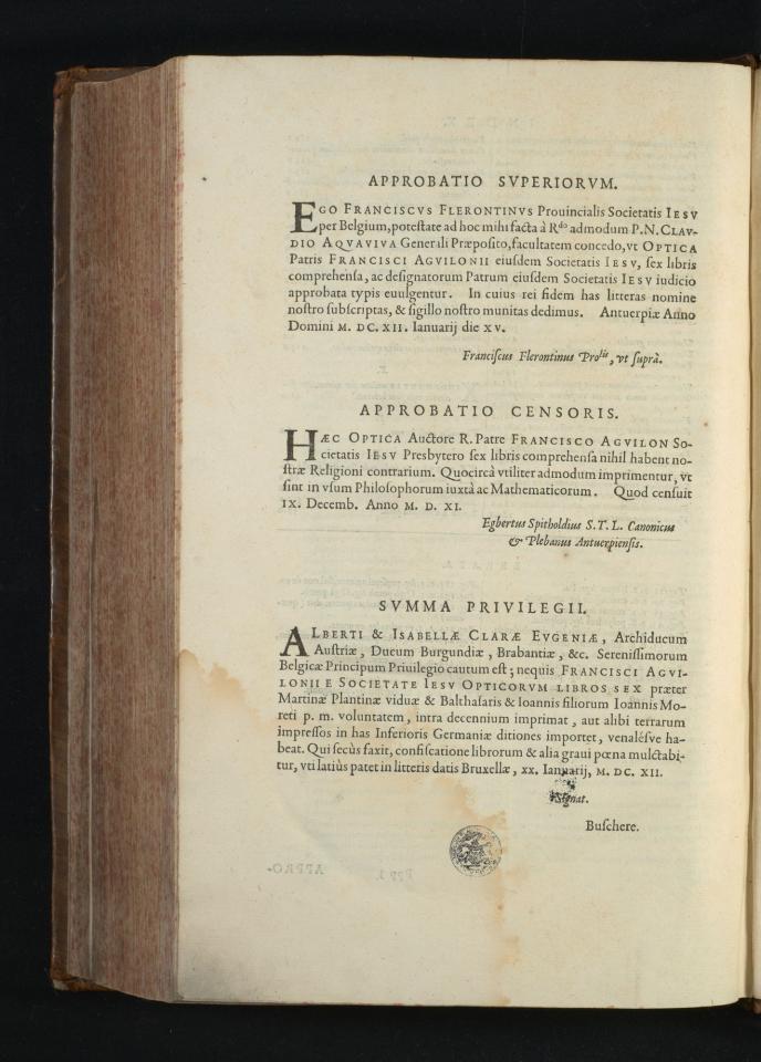 De samenvatting van het privilege in: Franciscus Agvilonius, Opticorvm libri sex, Antverpiæ, ex officina Plantiniana, apud viduam et filios Io. Moreti, 1613, 2o. (MPM R 52.1, fol. 3P3 verso)