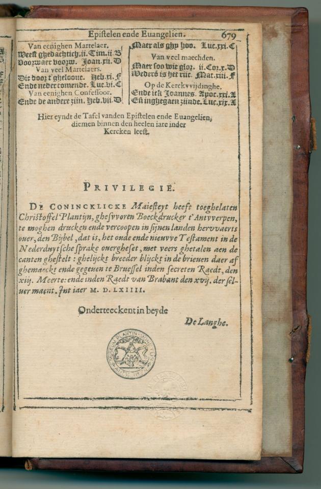 De samenvatting van het privilege in: Het nievvve Testament ons heeren Iesv Christi, Antwerpen, by Christoffel Plantijn, 1577, 8vo. (MPM A 590, fol. v4 recto)