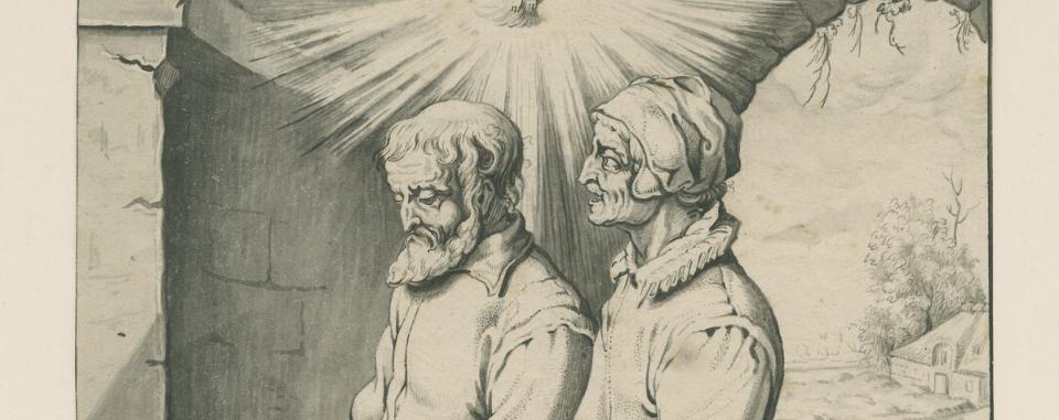Wat een kracht toont dit vreedzaam paar, dat samen zoveel stormen heeft overleefd. De kunstenaar Jacob de Gheyn toont het belang van zoete eenheid en van devotie. De Heilige Geest komt als duif man en vrouw inspireren die op de rand van een bankje de gevouwen handen in hun schoot houden.