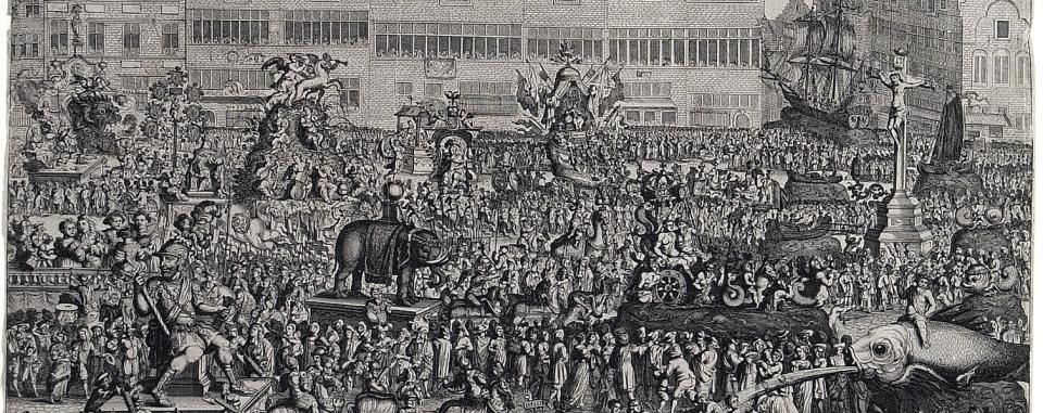 In de 16e en de 17e eeuw trokken vele stoeten en processies door de straten van Antwerpen. Naar aanleiding van de Ommegang van 1685 publiceerde de Antwerpse drukker Hieronymus Verdussen de Jonge deze prent van Gaspar Bouttats samen met een begeleidende tekst.
