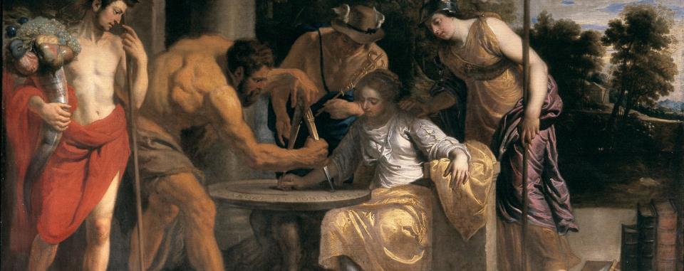 Quellin kreeg als opdracht de kwaliteiten van de drukkerij de ‘Gulden Passer’ uit te beelden. Op het schilderij zit Constantia – de standvastigheid – in het midden, terwijl ze de punt van de passer vasthoudt. Naast haar staat Herakles als symbool van de labor, de arbeid. Herakles draait de passer rond. Achteraan kijken Hermes – de god van de handel – en Athena – de godin van de wijsheid – aandachtig toe.