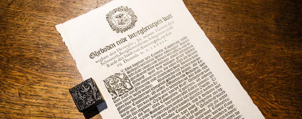 Alsoo dagelijcx vele Colonels / Capiteynen / ende Soldaten verlatende henne compaignie / binnen deser stadt comen ende blyven vernachten / niet teghenstaende tselve nu onlancx alnoch verboden is gheweest / waer deur dickwils groote disordre (wanorde) ende inconvenienten (ongemakken) / soo inden leger als binnen deser stadt zijn gebeurende / ende alnoch meer soude / soo verre daerinne niet en worde versien: Waerom soo eest (is het) datmen van weghen sijne Hoocheyt wel scherpelick gebiedt ende beveelt / alle Colonellen / Capiteynen / oft andere Officieren ende Soldaten / wye dat sy zijn / hen van stonden aen te vertrecken wt (uit) deser stadt / elck onder sijn regiment / Op te pene van lyf-straff: Verbiedende van weghen als vore / alle Colonnellen / Capiteynen / oft anderen Officieren ende Soldaten / hier binnen deser stadt te commen / oft te vernachten / dan met expres consent (uitdrukkelijke toestemming) van hunnen Overste / Te weten / de Colonnels met consent vanden Mareschal vanden Legher / de Capiteynen vanden Colonnels / ende de Soldaten met consent van hunnen Capiteyn / daer onder sy respective zijn liggende / ende dat oock opde pene van lyf straff: Verbiedende voorts alle Herbergiers / Cabarettiers / Tafel-houders (traiteurs) / ende alle andere Borgeren ende Inghesetenen / eenighe vande voors. Colonnellen / Capiteynen / oft andere Officieren oft Soldaten / van wat Natie die zijn / Huysen oft Cameren te verhueren oft hunlieden te logeren / Op de pene van twelff Carolus gulden / te bekeeren in dryen / d’een deel tot behoef vanden Officier / oft vanden Capiteyn die het exploict (aanzegging? / uitvoering?) in sijnen Wijcke sal doen / tweede vanden aenbrenger / ende het derde tot behoeff vanden armen deser stadt / ende daerenboven noch arbitralijck ghecorrigeert (gerechtelijk gestraft) te worden.