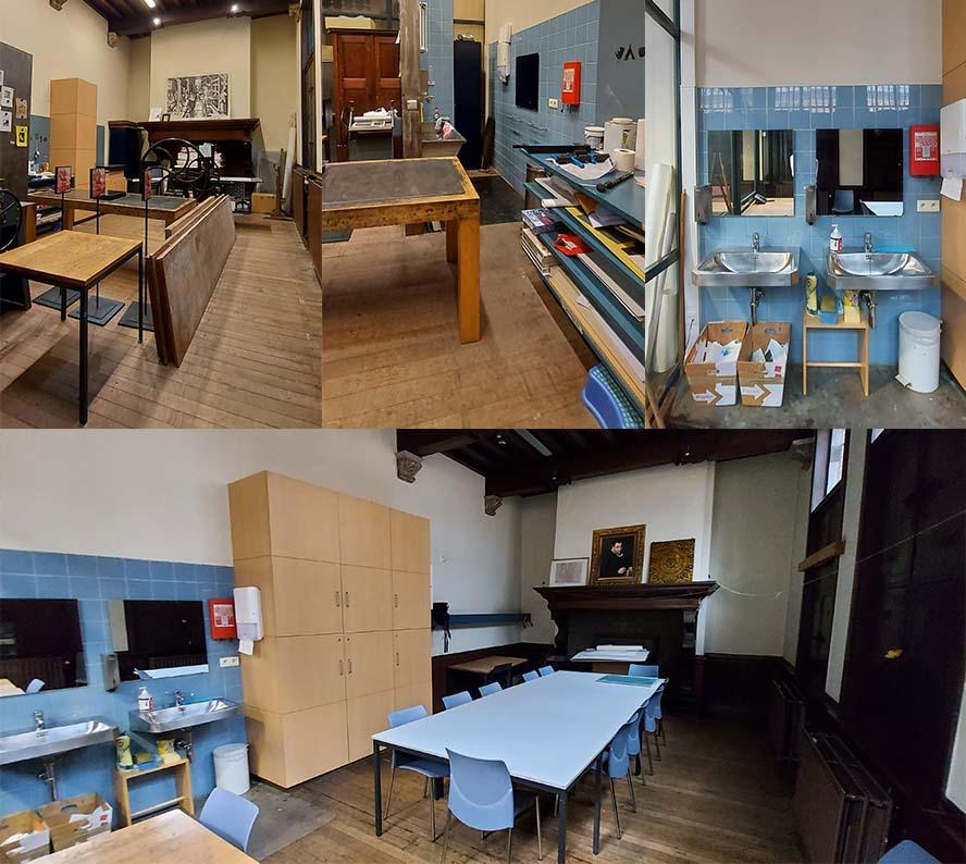De ateliers worden praktisch en gezellig ingericht met mooie, warme materialen en de juiste belichting. Maar ze willen ook de creativiteit stimuleren. Zo vind je er verschillende drukwerken, drukbenodigdheden en technieken en kan je snuisteren in boeken en prenten om inspiratie op te doen.