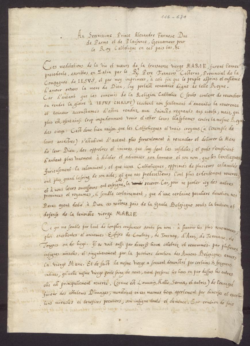 Au Serenissime Prince Alexandre Farnese Duc de Parme et de Plaisance, Gouverneur pour le Roy Catholicque en ces païs bas, &c.