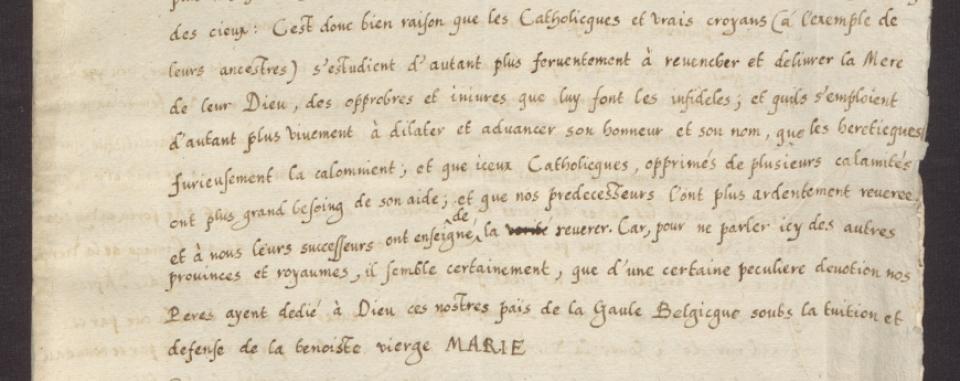 Want zoals de vijanden van de katholieke godsdienst (onder het mom van het verdedigen en eer bewijzen aan Jezus Christus) niet alleen de eerbied en de eer proberen te vernietigen die gewoonlijk bestemd is voor de heiligen die in de hemel vertoeven, zo durven zij ook, wat nog erger is, in hun al te grote onbeschaamdheid hun godslasteringen te braken en te richten tegen de koningin zelf der hemelen. Het is dus met goede reden dat de katholieken en echte gelovigen (volgens het voorbeeld van hun voorvaderen) zich er des te ferventer op toeleggen om de Moeder van hun God te verdedigen en te bevrijden van de smaad en beledigingen die de ongelovigen haar toebrengen en dat ze des te heviger ervoor ijveren haar eer en naam te verspreiden en te vergroten als de ketters haar in razernij belasteren. Het is daarom ook dat deze katholieken, verdrukt door verschillende rampen, meer nood hebben aan haar hulp, en dat onze voorgangers haar des te vuriger hebben vereerd en aan ons, hun opvolgers, hebben geleerd haar te vereren. Om van andere streken en koninkrijken hier niet te spreken, lijkt het immers zeker dat onze vaders vanuit een zekere bijzondere devotie onze streken van de Franse Nederlanden aan God hebben gewijd onder de bescherming en verdediging van de gezegende Maagd Maria.