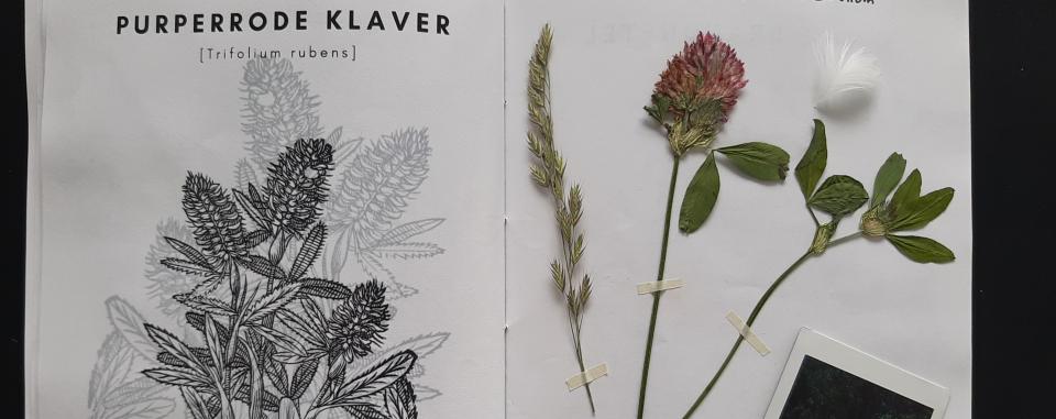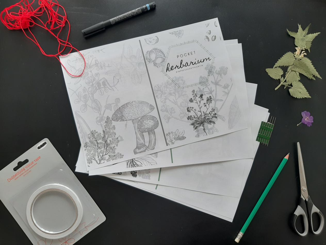 Tijdens mijn wandeling plukte ik enkele mooie bloemen en planten. Hierbij let ik erop dat ik de wortel niet mee uittrek, waardoor het plantje de kans krijgt om opnieuw te groeien. Bij het thuiskomen steek ik de plantjes zo snel mogelijk tussen vellen keukenrol of krantenpapier en steek ik die daarna tussen een dik boek. Zo moeten de plantjes 1 à 2 weken drogen. Erg dikke en sappige bloemen, zoals paardenbloemen, kunnen beginnen te schimmelen. Daarom controleer je best regelmatig het papier en vervang je het wanneer het vochtig blijft. Wanneer de planten volledig droog zijn, kunnen ze in het herbarium. Ik heb het mijne afgedrukt op A4-formaat, maar groter of kleiner is ook mogelijk. Bevestig de plantjes met een tape op textiel- of papierbasis (zoals behangersplakband) om schimmel te voorkomen. Daarna kan je de pagina's afwerken zoals je zelf wilt! Ik heb vaak ook de houtblokillustraties ingekleurd, om het boekje wat levendiger te maken.