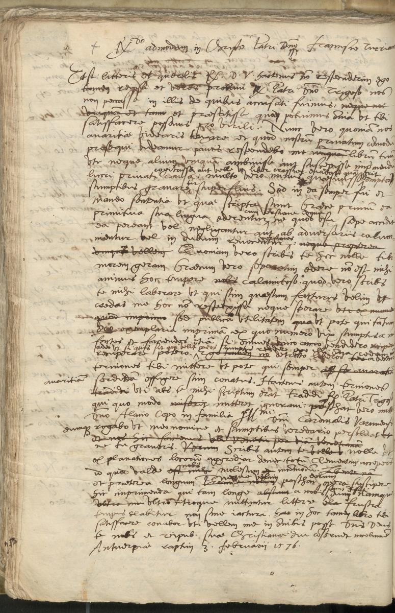 Etsi litteris et querelis Rev. D V. hactenus non responderim ego tamen reipsa et verbis probavi Rev. Patri Dno Trigoso nos non peccasse in illis de quibus accusati fuimus : et præstitisse quæ potuimus omnia ut tibi satisfacere possemus pro virili. Nunc vero quoniam nos avaritiæ videaris taxare et quod nostrum privatum commodum prosequi videamur, paucis respondebo me librum tuum uti neque alium umquam ambivisse aut suscepisse imprimendum lucri privati causa: multo vero minus quæsivisse, cogitasse aut velle ut liber crassior evadat quam erit ut emptor sumptibus gravaretur superfluis. Sed in ea semper fui et maneo sententia ut quæ scripta sunt Græce primum ea primitiva sua lingua ederentur cum versione idque ne quod usu saepe accidit ea pereant vel negligantur aut ab adversariis calumnientur vel in dubium revocentur versiones. Quoniam vero scribis te hoc nolle tibi morem geram, Graecum vero separatim edere non est mihi animus hoc tempore calamitoso. Quod vero scribis te mihi laborare ut qui sim quaestum facturus velim ut credas me hoc non respexisse neque sperare sed publicam utilitatem ut pote qui tantum 800. exemplaria imprimam ex quo numero vix sumptus a me factos et faciendos etiam si omnes unico anno vendidero recuperare potero, adeo ut si quis sit qui velit meos sumptus reddere ego illi omnia cedam. Ego tamen non detrecto liberos a vectura terniones tibi mittere ut pote qui semper avaritiam sordidam effugere sim conatus. Hactenus autem terniones uti abs te niihi scriptum erat tradidi Rev. Patri Trigoso qui quo modo mitteret ignoravi: posthac vero mittam Dno. Alano Copo in familia Illmi Dni. Cardinalis Varmiensis eumque rogabo ut meo nomine et sumptibus veredario persolvat ne tu graveris. Scribis autem te nolle ut explanationes locorum aggrediar donec totum Clementem acceperis id quod valde nobis molestum, incommodum et praeterea longum. Nequo velim posthac eorum opera suscipere liic imprimenda qui tam longe a nobis sunt distanti dum namque ultro citroque mittuntur litterae frustra tempus elabitur non sine jactura. In hoc tamen libro tibi satisfacere conabor uti vellem me in omnibus posse. Dns. Deus te nobis et reipub. suae Christianae diu conservet incolumem. Antverpiae raptim 3. Februarij 1576.
