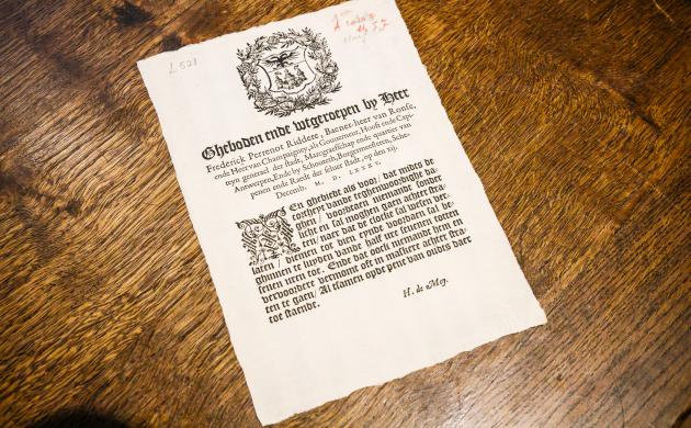 Bevelschrift om tijdens de donkere dagen niet zonder licht de straat op te gaan na het luiden van de avondklok van halfzeven tot zeven uur. Tevens geldt er een verbod gemaskerd de straat op te gaan.