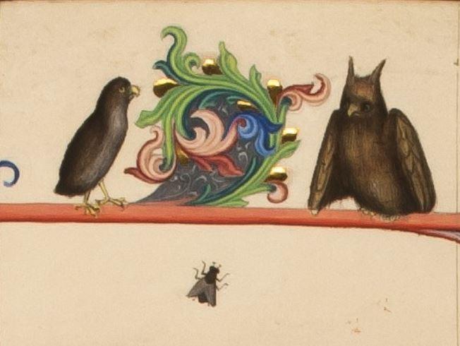 Er is dus een tegenstelling tussen wat er zich in de marge afspeelt en wat er in de hoofdtekst van het manuscript gebeurt. Vaak wordt die tegenstelling nog verder kracht bijgezet door ronduit kwaadaardige symbolen, zoals uilen en vliegen.